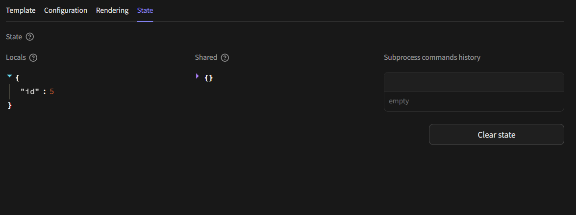 The State tab provides a real-time view of the current state of locals and shared variables used in your templates via State API. Additionally, it shows subprocesses that have been run from within the template. This helps in debugging and ensures that all parts of the template are functioning as intended.