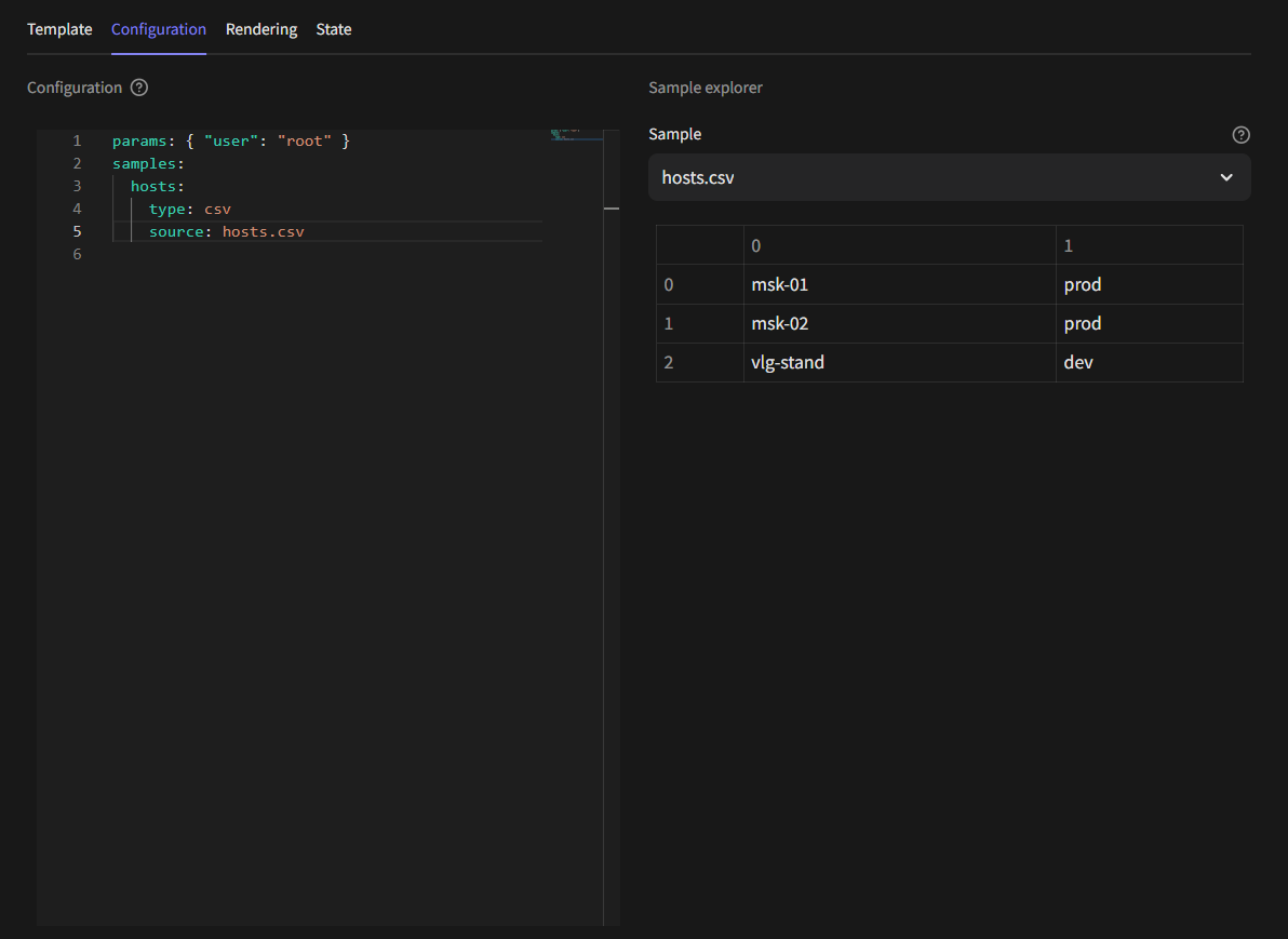 In the Configuration tab, you can define and adjust the parameters and samples used in your templates. There is also sample explorer there which will help you to quickly preview data and check sample structure.