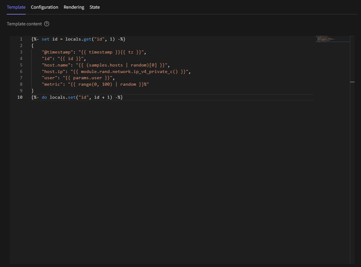 The Template tab is where you can write and modify your event templates. It features a code editor with basic syntax highlighting and autocompletion, ensuring that your templates are accurate and easy to read.