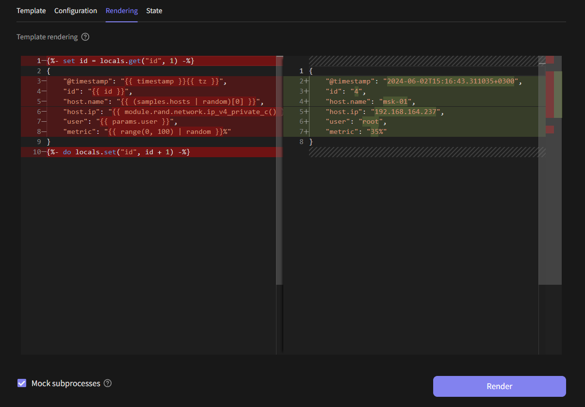 The Rendering tab allows you to render your templates and visually compare the output using a diff editor. This tool is valuable for ensuring that your template's output matches your expectations, highlighting any differences between the template code and the resulting events.